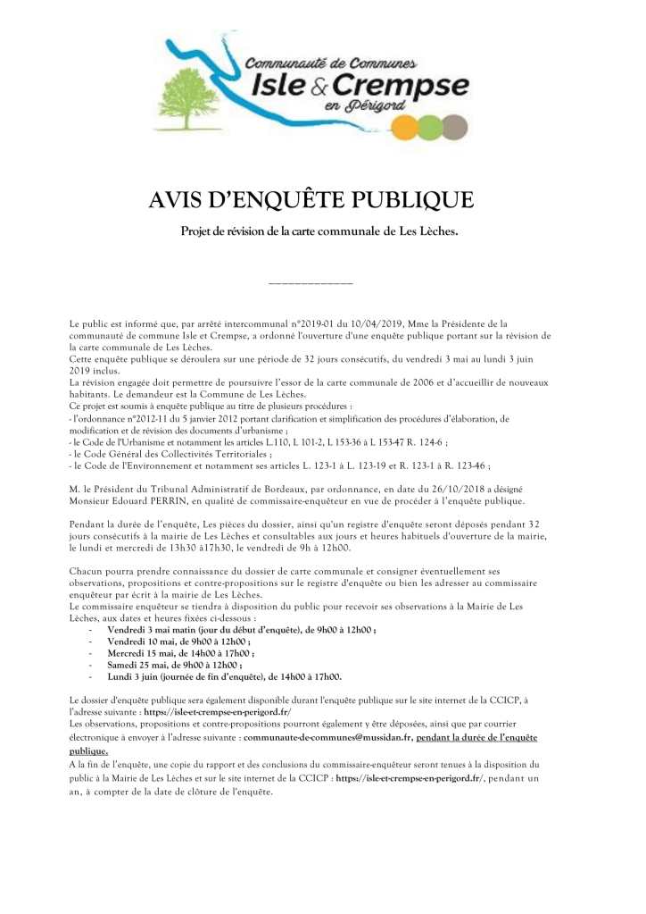 Une enquête publique s’est déroulée du vendredi 03 mai au vendredi 03 juin 2019 inclus. Le dossier est consultable en ligne ou à la mairie de Les Lèches.