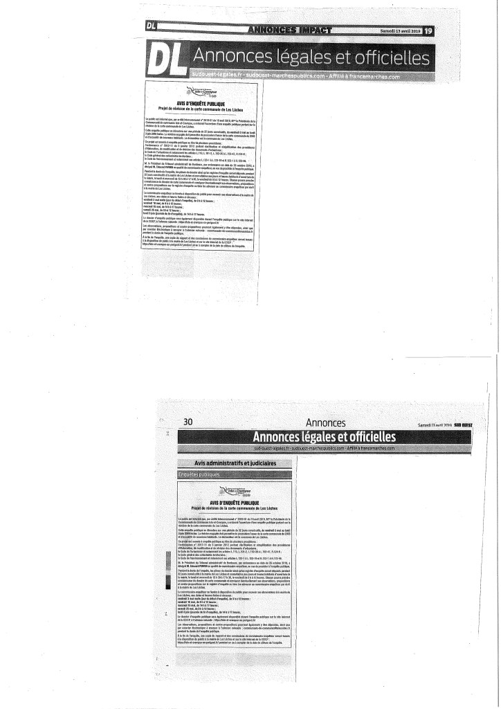 II) Parutions aux 2 J.A.L. de l’Avis d’enquête publique.