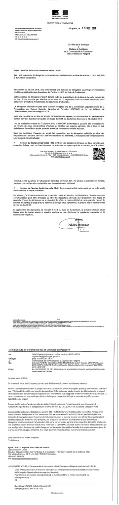 IV) Réponse du Préfet + Mail correctif de la DDT sur la demande de dérogation relative à la révision de la carte communale de Les Lèches.