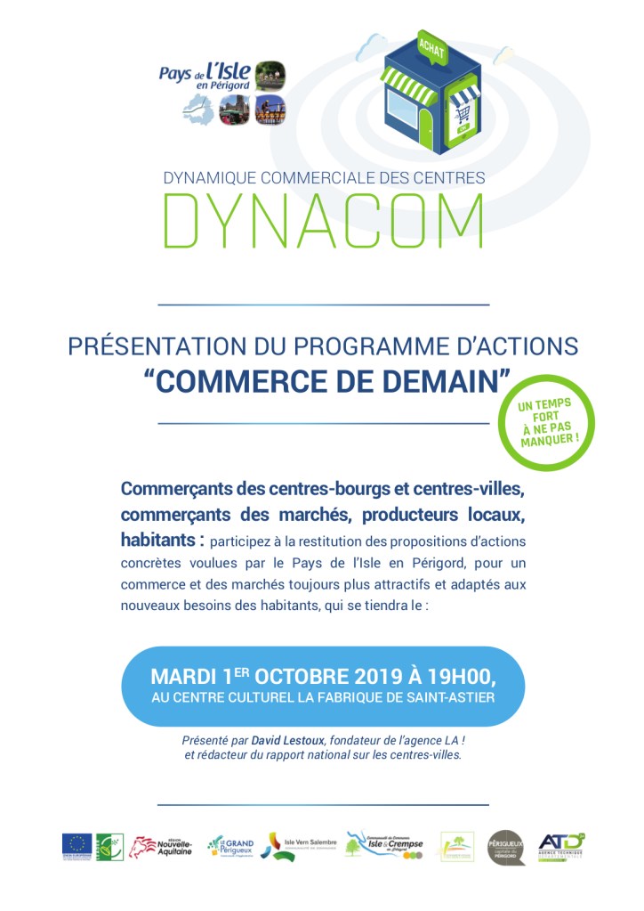 Venez participer à la restitution de l’étude DYNACOM portée par la communauté de communes Isle et Crempse en Périgord et le Pays de l’Isle pour l’avenir de nos centres bourgs et de nos commerces de proximité.