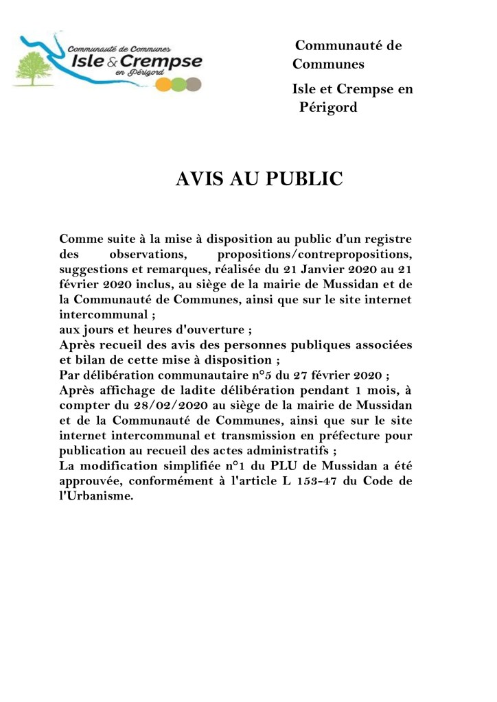 Comme suite à la mise à disposition au public d’un registre des observations, propositions/contrepropositions, suggestions et remarques, réalisée du 21 Janvier 2020 au 21 février 2020 inclus, au siège de la mairie de Mussidan et de la Communauté de Communes, ainsi que sur le site internet intercommunal ;