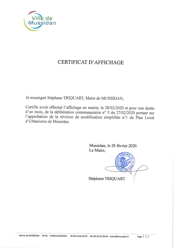 Après affichage de ladite délibération pendant 1 mois, à compter du 28/02/2020 au siège de la mairie de Mussidan et de la Communauté de Communes, ainsi que sur le site internet intercommunal et transmission en préfecture pour publication au recueil des actes administratifs ;