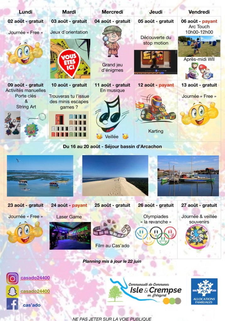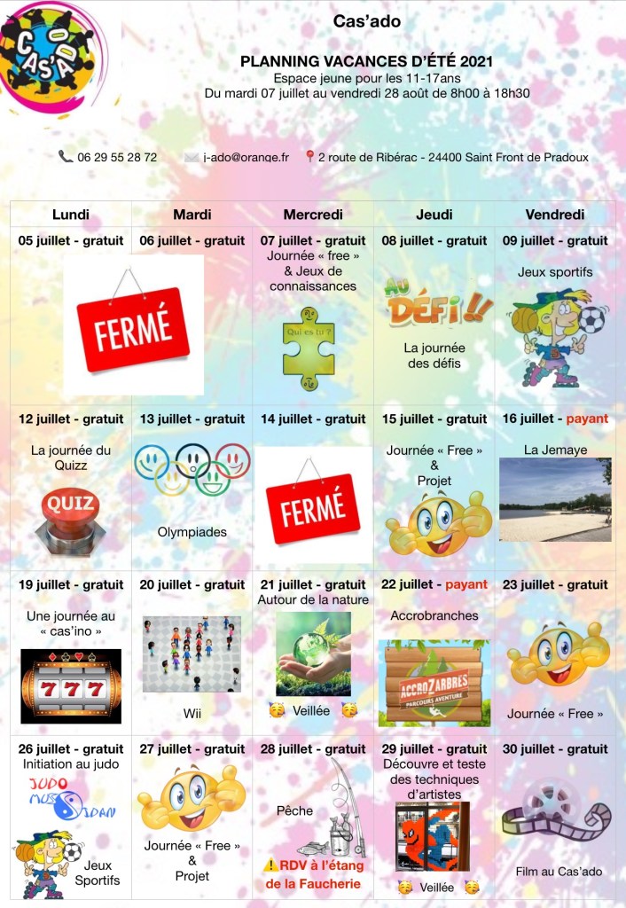 Vous trouverez ci joint le planning des vacances d’été ainsi que la fiche d’inscription.