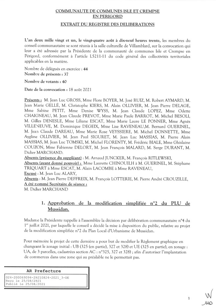 Comme suite à la mise à disposition au public d’un registre des observations, propositions/contrepropositions, suggestions et remarques, réalisée du 21 Juillet 2021 au 21 Août 2021 inclus, au siège de la mairie de Mussidan et de la Communauté de Communes, ainsi que sur le site internet intercommunal ;