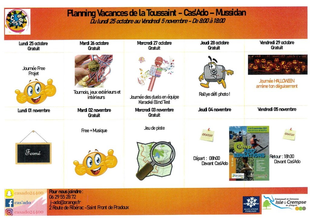 Programme du Cas’Ado du 25 octobre au 05 novembre Publié le 18 octobre 2021 par lydie19 Il reste quelques places pour le séjour Sensations ! Alors n’hésitez pas inscrivez-vous vite ! Partager : Cliquer pour partager sur X(ouvre dans une nouvelle fenêtre) X Cliquez pour partager sur Facebook(ouvre dans une nouvelle fenêtre) Facebook J’aime chargement… Similaire
