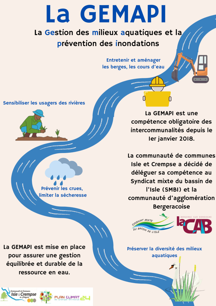 La communauté de communes Isle et Crempse en Périgord a décidé de déléguer cette compétence au Syndicat mixte du bassin de l’Isle (SMBI) et à la Communauté d’agglomération Bergeracoise (CAB).
